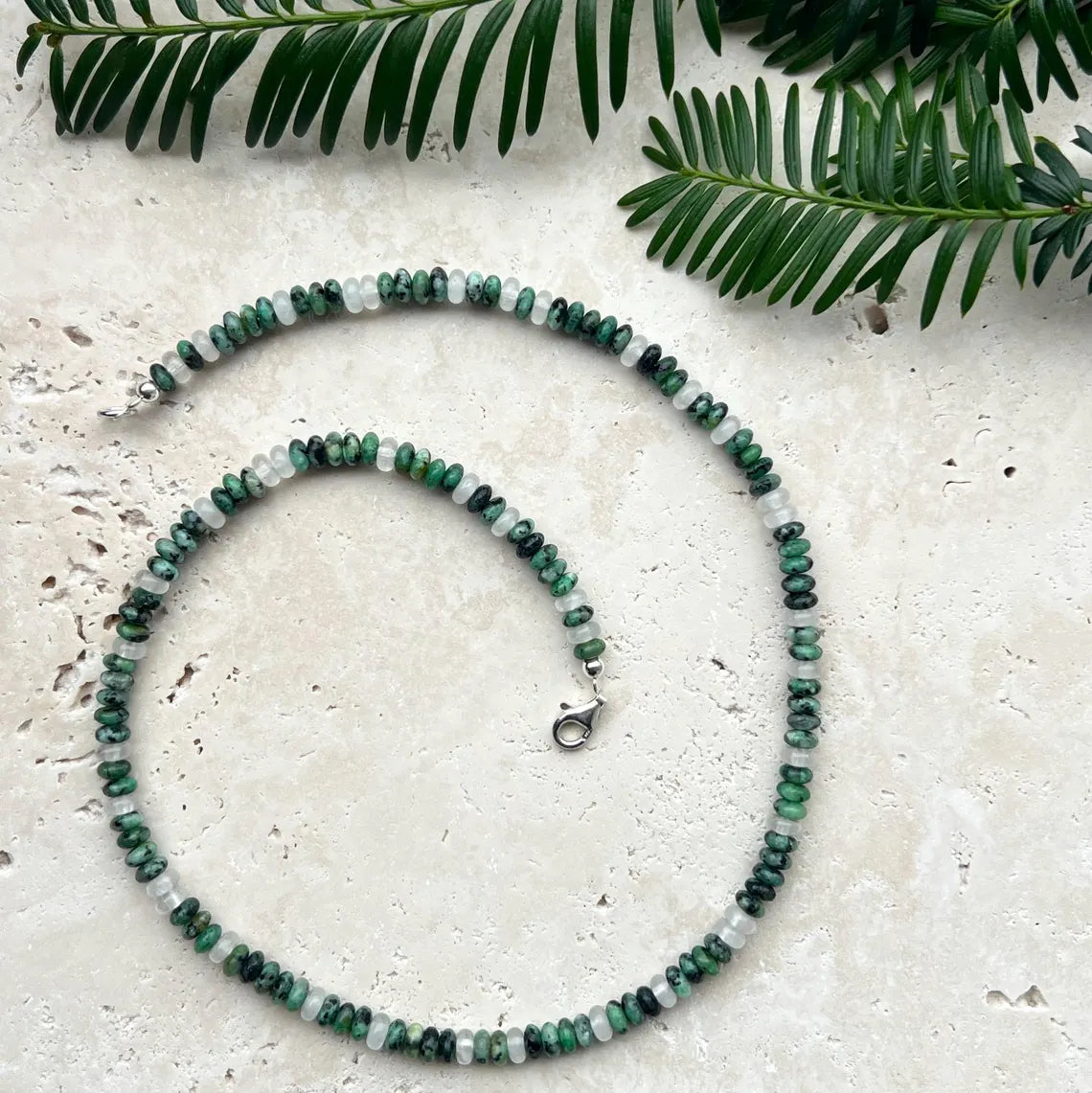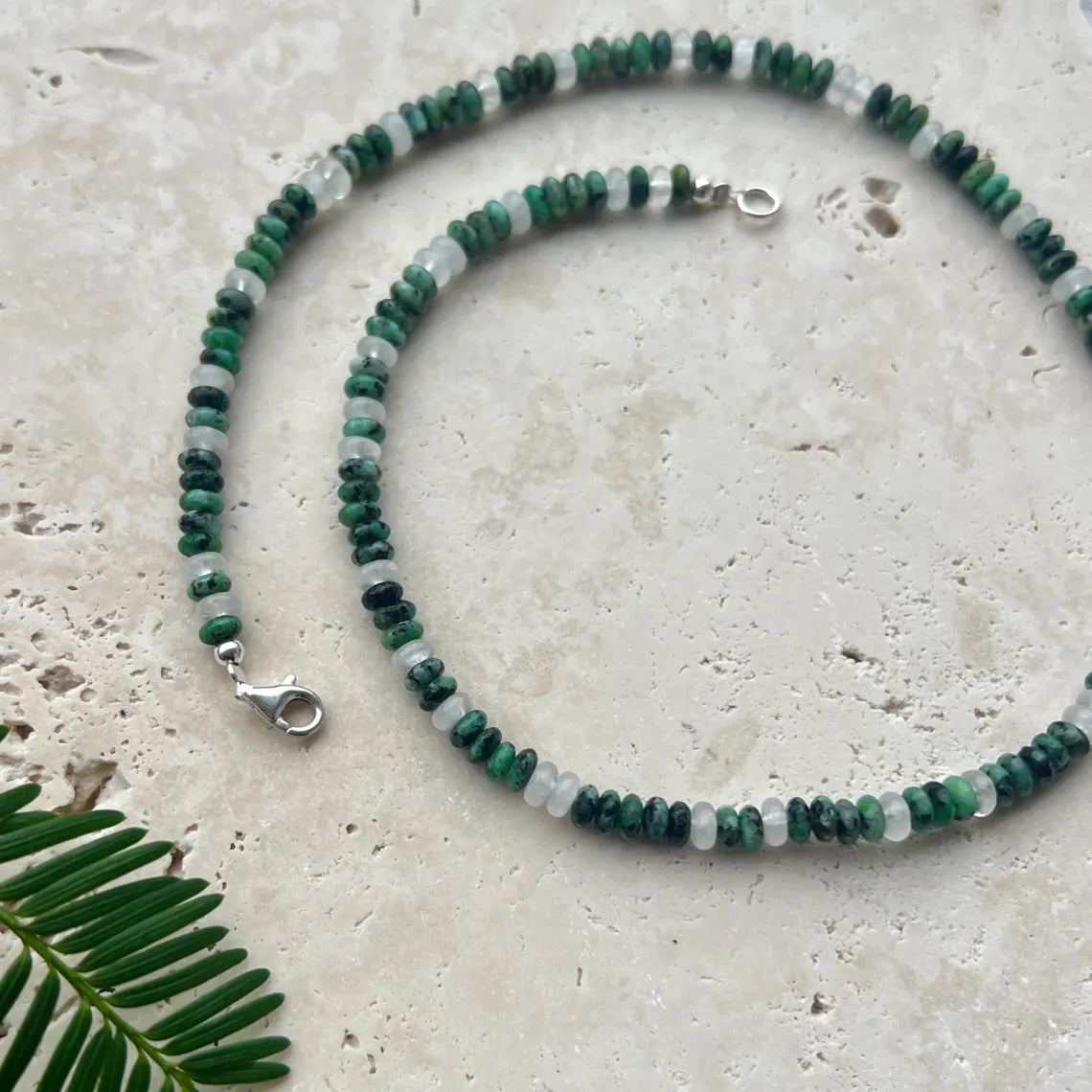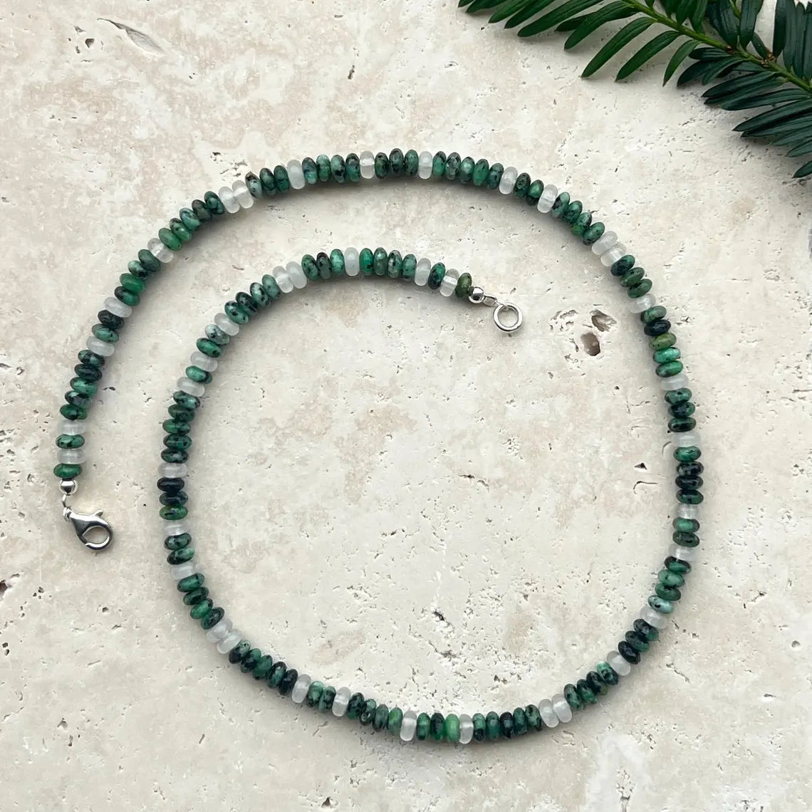 Perlenkette aus Edelstein (Seraphinit und Quarz) mit 925er Silber Karabinerverschluss.