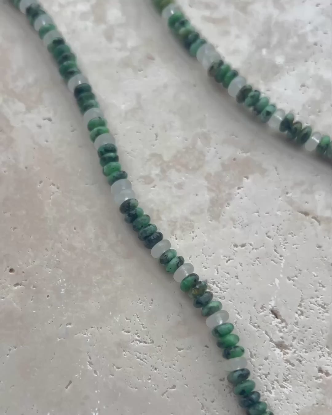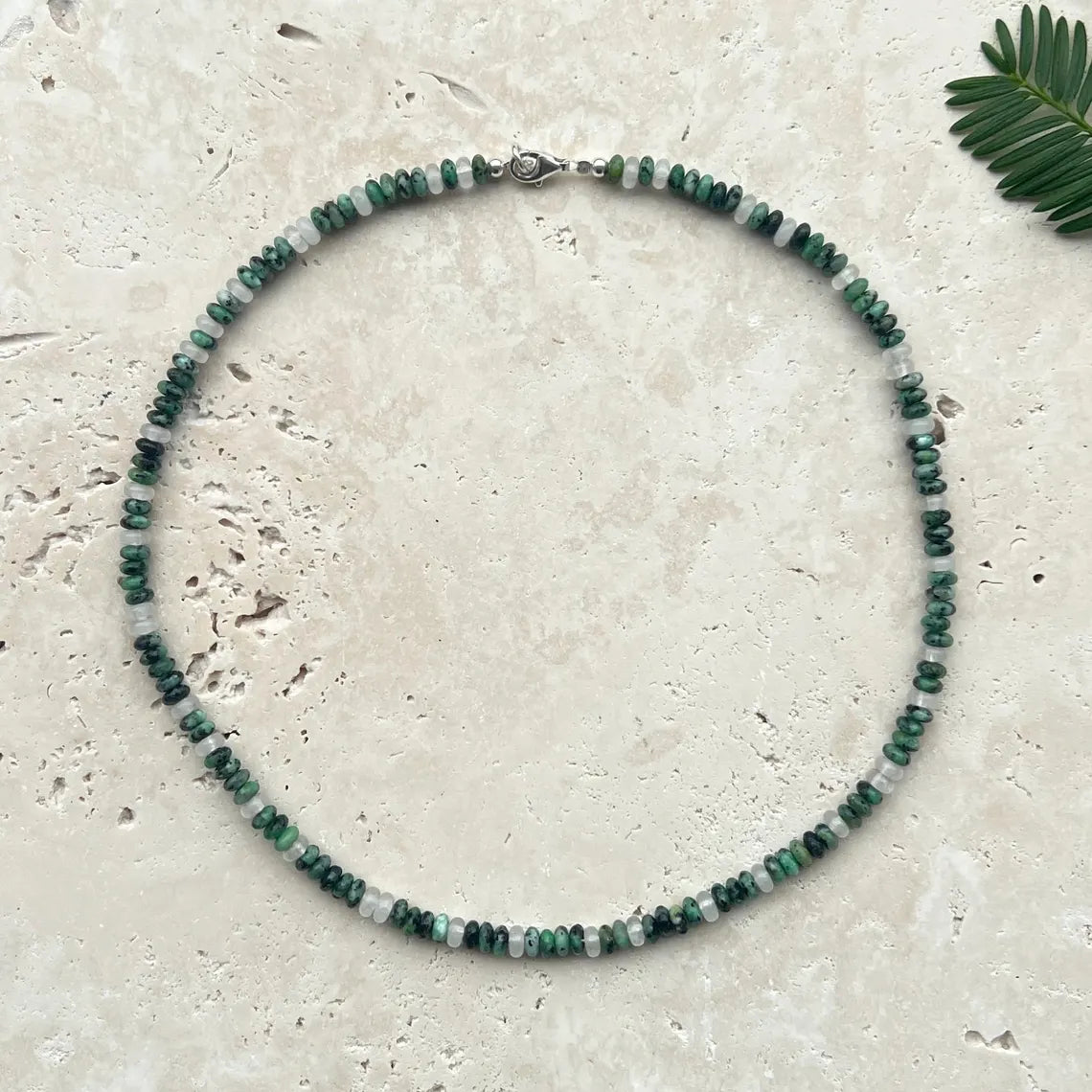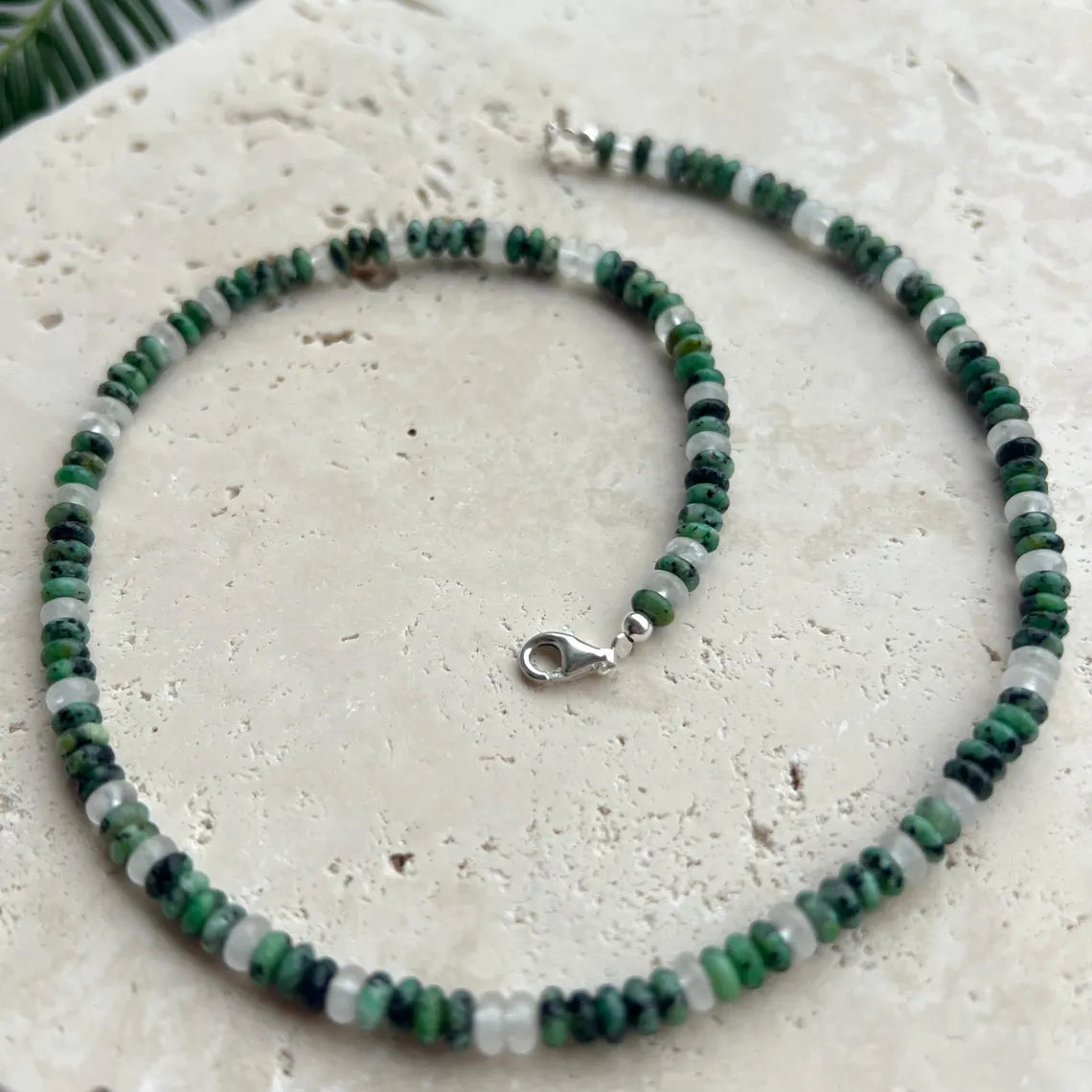 Perlenkette aus Edelstein (Seraphinit und Quarz) mit 925er Silber Karabinerverschluss.