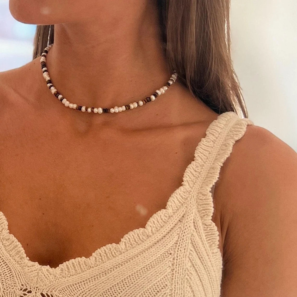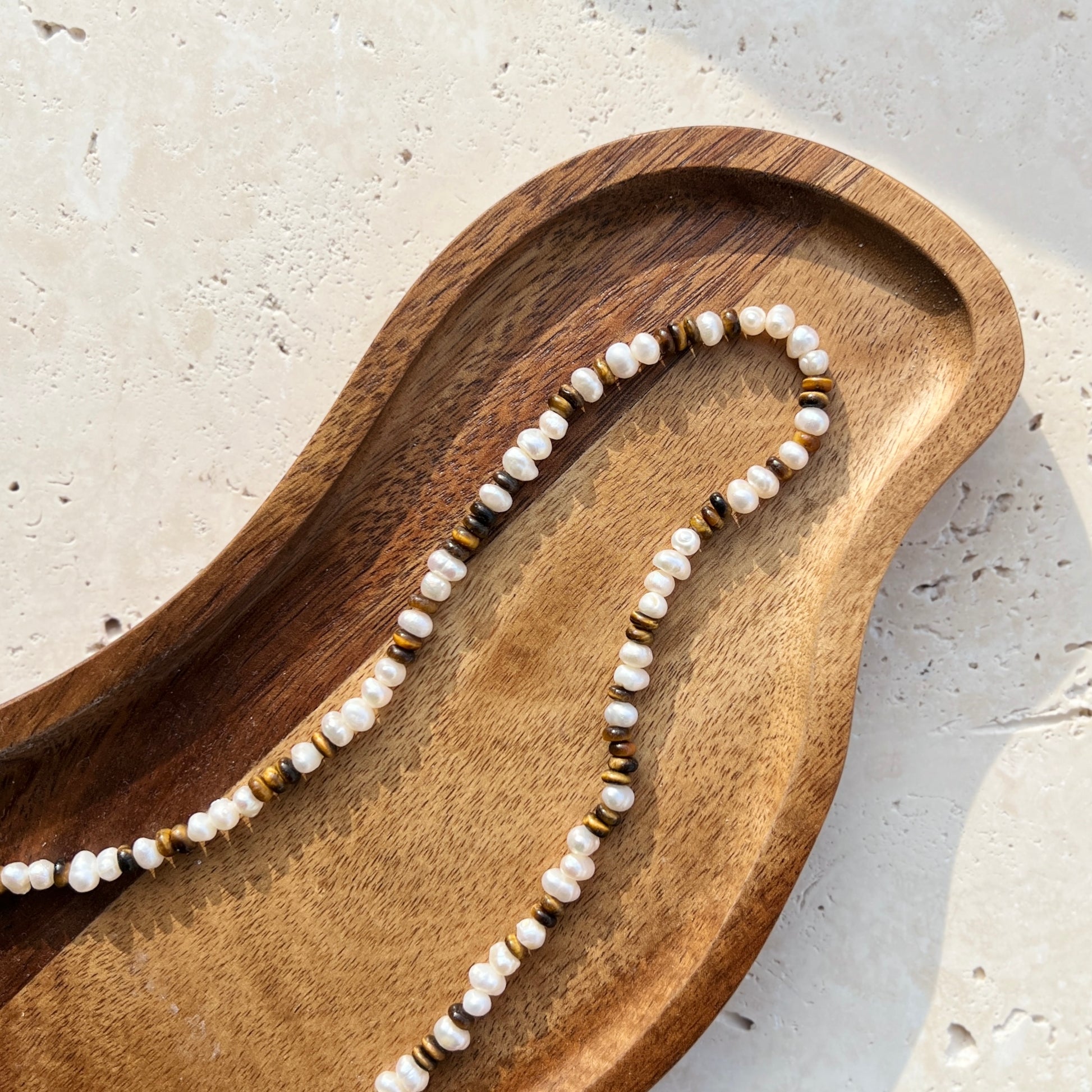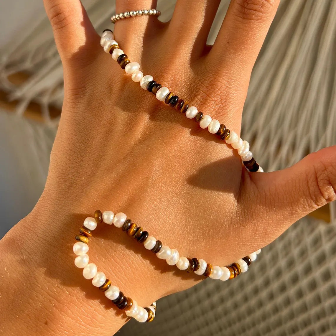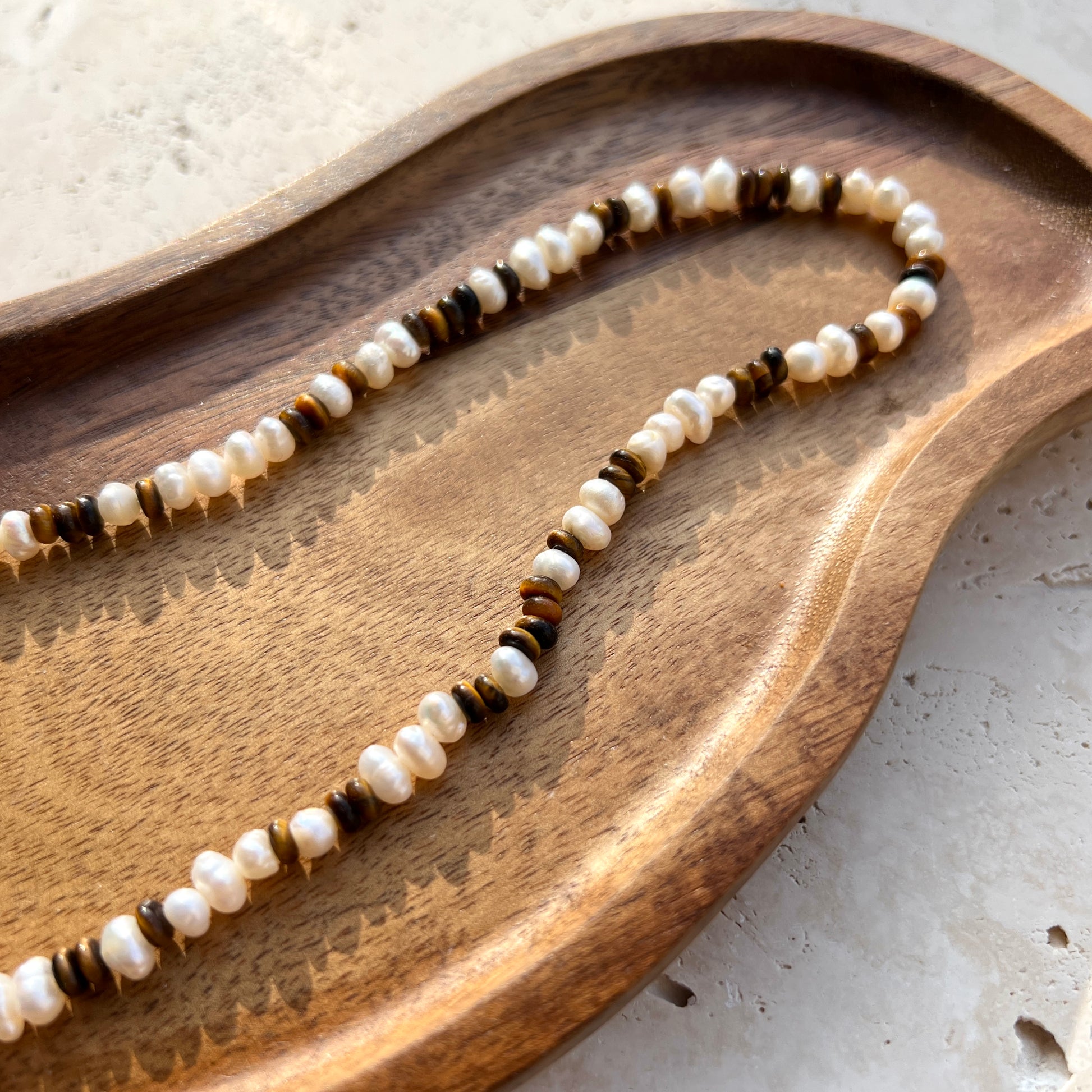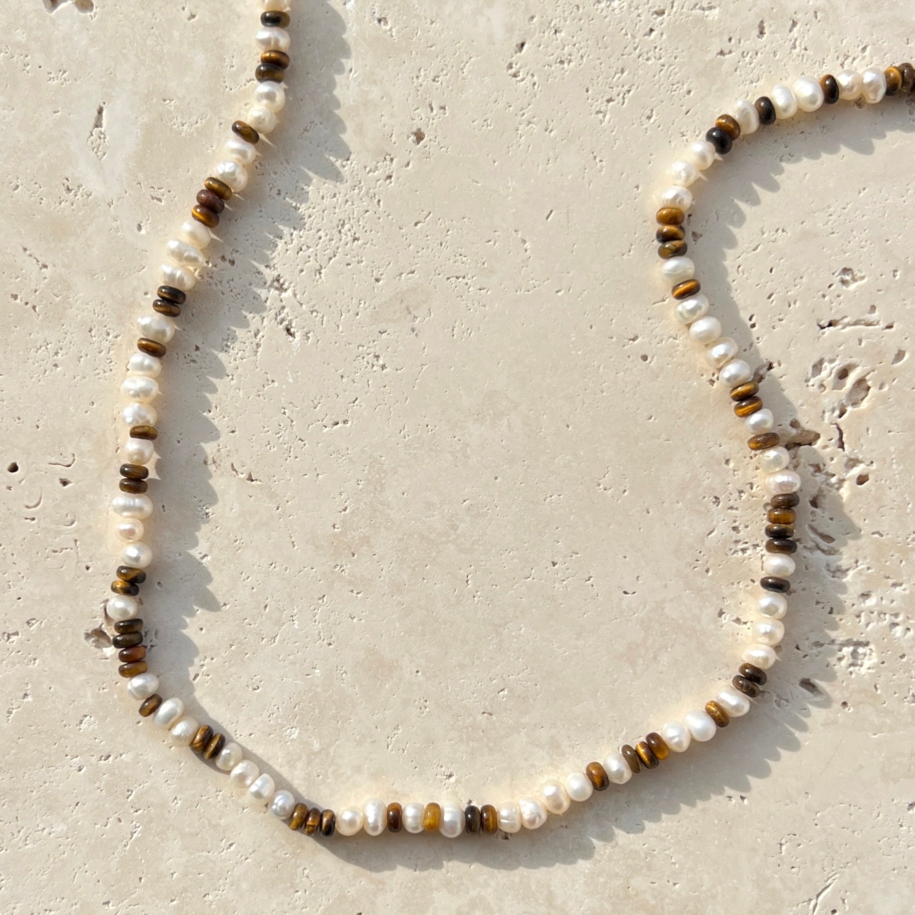Perlenkette aus Naturstein (Edelstein Tigerauge/Süßwasserperle) mit 925er Silber Karabinerverschluss.